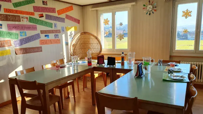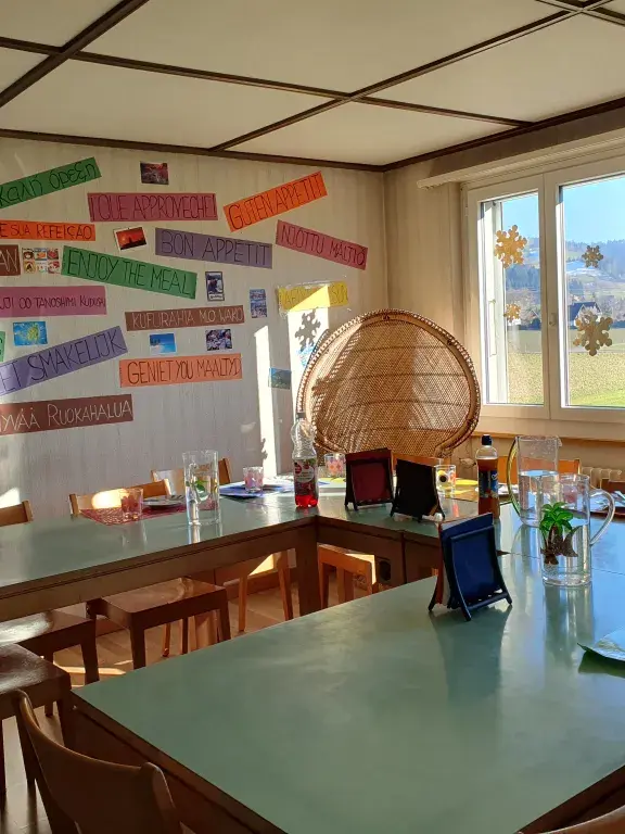 Die Tagesschule wird im Neubau der Schulanlage Lauperswil angeboten. Der helle und freundliche Raum hat genügend Platz und eine kleine Küche. Pausenplatz und Rasen bieten bei schönem Wetter eine gute Möglichkeit für gemeinsames Spielen draussen nach dem Essen. Es bestehen auch verschiedene Spielmöglichkeiten drinnen im Tagessschulraum.